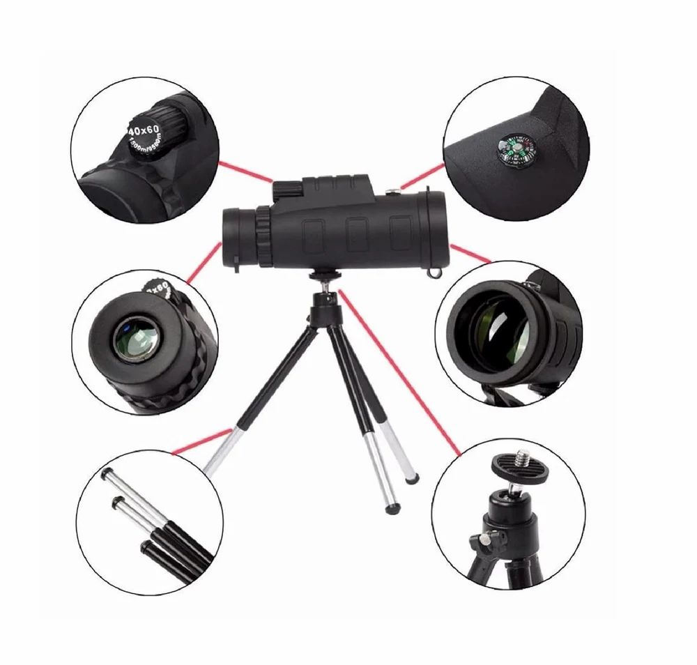 Buy 40x60 HD monocular telescope with tripod and smartphone adapter. Ideal for bird watching, hiking, travel, and outdoor adventures. Compact, waterproof, and shockproof design.
