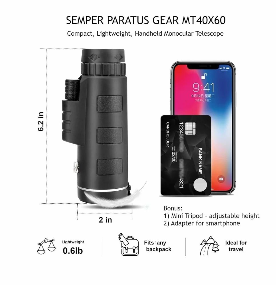Experience nature, wildlife, or sporting events like never before with the SFZ 40x60 Paratus Gear Monocular Telescope. Designed for outdoor lovers and travelers, this lightweight and compact monocular is perfect for hiking, birdwatching, hunting, camping, or concerts.